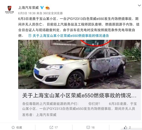 通告中表示,經過上汽服務站及工程師團隊查明,燃燒的原因為內飾起火導致。