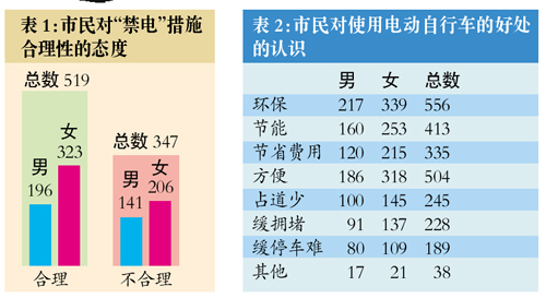 楊中藝表示,該項調查結果還顯示,雖然大多數市民(59.9%)認為“禁電”措施具有合理性(表1),但絕大多數市民認可電動自行車的好處,環保、方便、節能、節省費用成為市民支持使用電動自行車的主要理由(表2)。