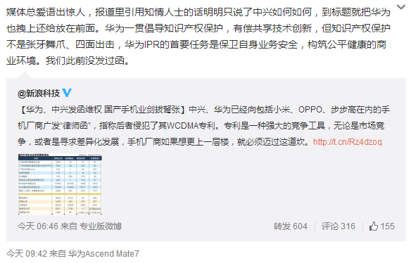 今天上午,華為知識產權部部長丁建新在微博上表示,“媒體總愛語出驚人,報道里引用知情人士的話明明只說了中興如何如何,到標題就把華為也拽上還給放在前面。”他說,“華為一罐倡導只是產權保護,有償共享技術創新,但只是產權保護不是張揚舞爪、四面出擊,華為IPR的首要任務是保衛自身業務安全,構筑公平健康的商業環境。我們此前沒發過函。”