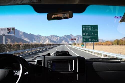 東風(fēng)御風(fēng)純電動(dòng)汽車行駛在拉薩市區(qū)與貢嘎機(jī)場(chǎng)的路上