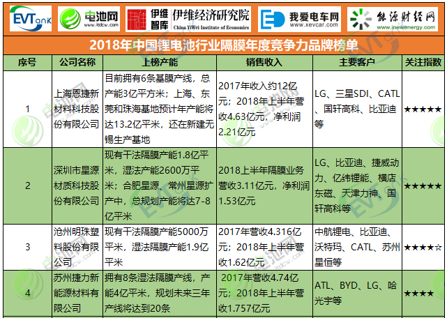 2018年中國鋰電池行業(yè)隔膜年度競爭力品牌榜單