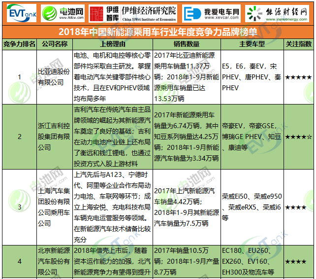 2018年中國新能源乘用車行業(yè)年度競爭力品牌榜單