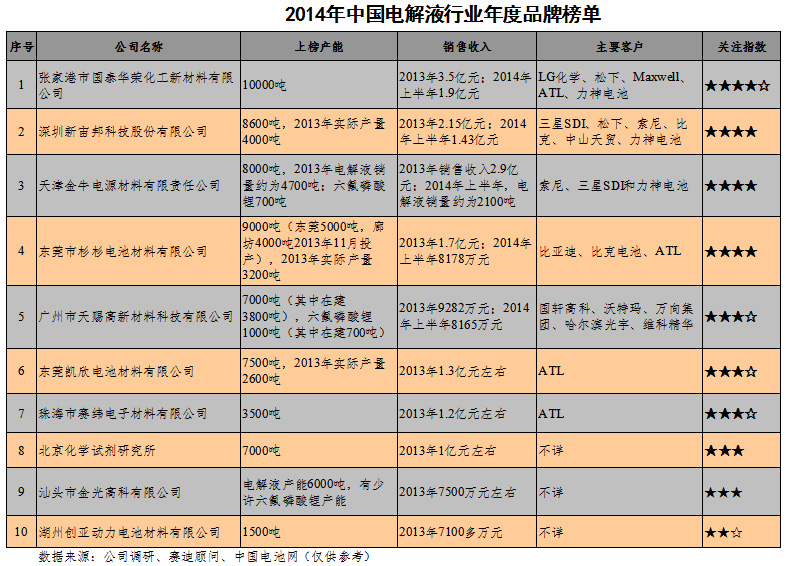 2014年中國(guó)鋰電池電解液行業(yè)年度品牌榜單發(fā)布