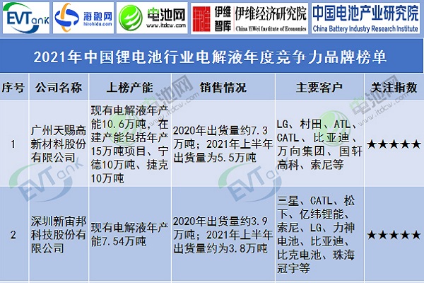 2021年中國鋰電池行業電解液年度競爭力品牌榜單