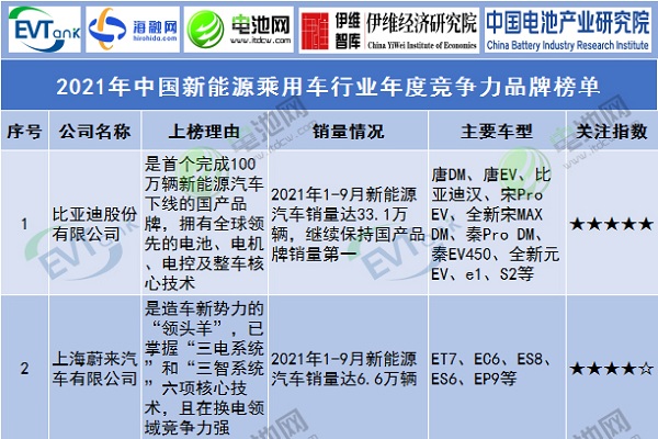2021年中國新能源乘用車行業年度競爭力品牌榜單
