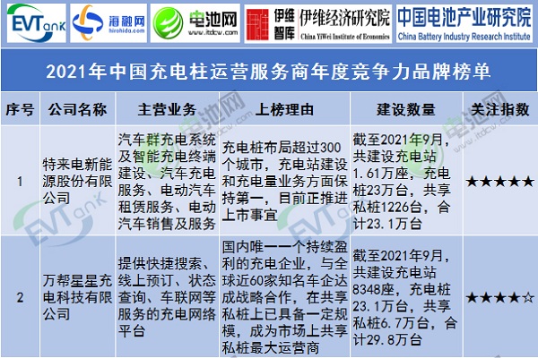2021年中國充電樁運營服務商年度競爭力品牌榜單