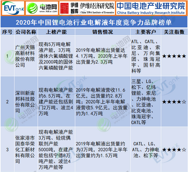 2020年中國鋰電池行業電解液年度競爭力品牌榜單