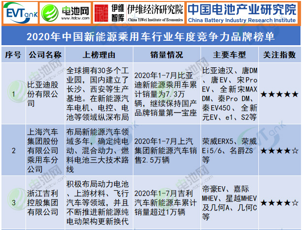 2020年中國新能源乘用車行業年度競爭力品牌榜單