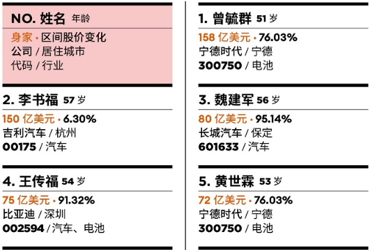 中國汽車富豪榜發布:寧德時代曾毓群首富 吉利李書福第二