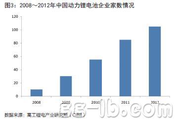 新進企業多,低端產能嚴重過剩。根據高工鋰電產業研究所(GBII)統計,2012年底中國動力鋰電池企業家數達到105家,而2008年的時候僅有10家動力鋰電池企業,過去4年增加95家(圖3)。  企業家數劇增,帶來產能急劇擴張,2013年的動力鋰電池產能約40億安時,2015年的產能約100億安時,2017年200億安時;而其中大部分產品一致性、循環壽命、能量密度等均不能滿足純電動汽車的需求。因此,一批曾經轟轟烈烈想在純電動汽車方面“大展拳腳”的企業,現在只能寄希望于低端的電動自行車市場來維持收入。