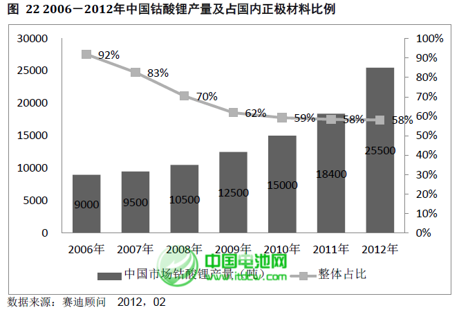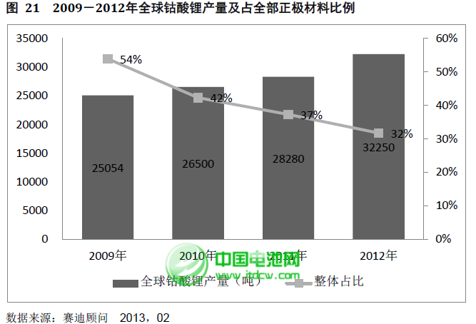 2012年全球鈷酸鋰銷量為31200噸,占全部正極材料的52.5%,在整個正極材料市場中占據(jù)了絕對重要的地位。隨著正極材料技術(shù)的不斷成熟,三元材料和磷酸鐵鋰等正極材料對鈷酸鋰的替代逐步加快,賽迪顧問認(rèn)為鈷酸鋰在鋰離子電池正極材料中的地位將逐步降低,但受益于新能源汽車對動力電池需求的加劇,鈷酸鋰正極材料的絕對數(shù)額在未來兩年內(nèi)還是會保持一定程度的上升,且其在正極材料中仍處于主導(dǎo)地位。