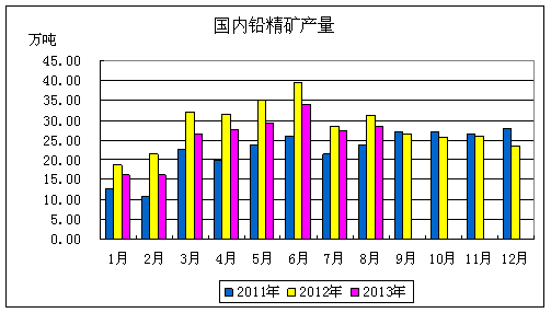 國家統計局數據顯示,2013年1-8月份我國鉛精礦產量為201.61萬噸,同比下降4.64%,其中8月份產量為28.43萬噸,同比下降8.94%。