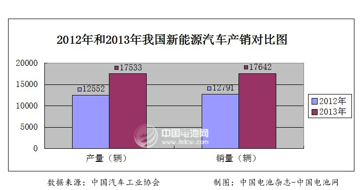 中國電池雜志-中國電池網1月14日訊(趙卓然  北京報道) 據中國汽車工業協會最新公布的數據顯示,2013年我國新能源汽車共生產1.7533萬輛,同比增長39.7%。其中,純電動汽車1.4243萬輛、插電式混合動力3290輛;新能源汽車銷售1.7642萬輛,同比增長37.9%,其中純電動汽車1.4604萬輛、插電式混合動力3038輛。