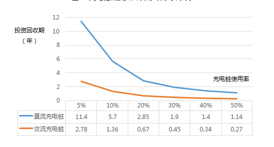 分析充電樁項目的投資與運營情況可以發(fā)現(xiàn),充電樁的投資回收期與充電樁的使用率關系密切。對于交流慢充樁來說,使用率為5%的情況下,回收期需要近3年,若提升使用率到30%(每天充電8小時),則投資回收期被縮短到半年以內。這個情況對于直流快充樁表現(xiàn)更為明顯,在使用率為5%和30%的情況下,投資回收期分別為12年和2年。提升充電樁使用率將大幅度縮短充電樁的投資回收期。