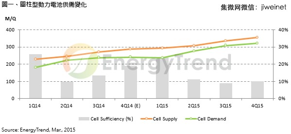 TrendForce旗下綠能事業(yè)處EnergyTrend研究經(jīng)理呂理舜表示,隨著環(huán)保意識的興起,電動自行車與電動汽車在市場的普及度逐漸增加,亦帶動圓柱型動力電池在移動載具需求將從去(2014)年的1.11億顆成長至今(2015)年1.45億顆,年成長30%;而整體圓柱型動力電池需求將從去年的8.82億顆成長至今年的11.71億顆,年增率為32%。