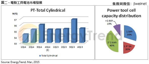 EnergyTrend指出,在IT需求逐漸走向輕薄化而減少電池芯顆數(shù)的趨勢下,動力工具更是電池芯廠積極加入的藍(lán)海市場;由于電動工具功率輸出較高,產(chǎn)品壽命要求也較為嚴(yán)苛,市場需求穩(wěn)定發(fā)展,然同樣面臨電池容量提升而使用顆數(shù)降低的現(xiàn)象,因此今年度鋰電池在電動工具市場需求仍維持持平局面,約占2.2億顆。