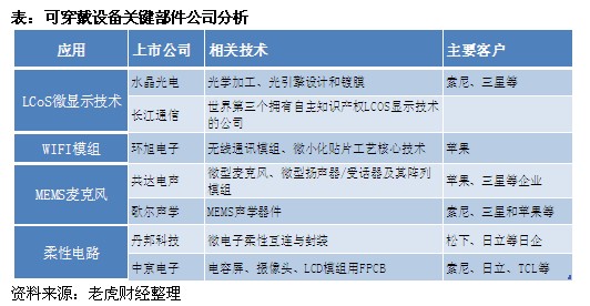 仔細分析其產(chǎn)業(yè)鏈,事實上可穿戴設備需要使用的幾個關(guān)鍵元器件包括攝像頭、電路板、柔性材料、觸控面板、電池等模組。此外,智能眼鏡+手表的硬件組合也需要兩個產(chǎn)品之間頻繁的信號互聯(lián), 勢必增加對無線模組的需求。