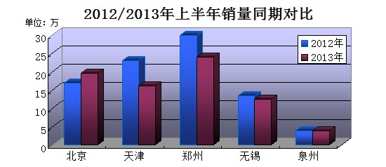記者對北京、天津、鄭州、無錫、泉州五個城市經(jīng)銷商進行了抽樣調查,數(shù)據(jù)顯示,與2012年上半年銷量對比,除北京市場增長15%外,天津、鄭州、無錫、泉州四城市銷量均呈現(xiàn)不同程度的下降