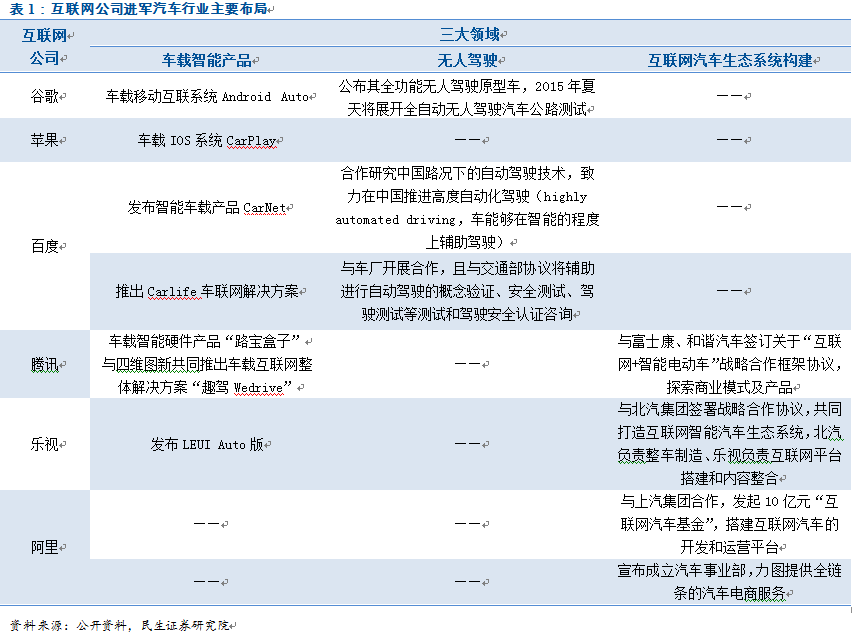互聯(lián)網(wǎng)公司成為進(jìn)軍汽車行業(yè)的先發(fā)力量,加快汽車智能化步伐。互聯(lián)網(wǎng)的革命性發(fā)展對傳統(tǒng)制造業(yè)產(chǎn)生巨大的沖擊,在汽車4.0智能化的時(shí)代,互聯(lián)網(wǎng)公司爭前恐后的涌入這一領(lǐng)域。從國外的谷歌、蘋果到國內(nèi)的BAT三巨頭以及樂視等互聯(lián)網(wǎng)公司,都欲要大施拳腳。