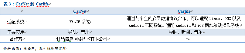 從百度推出CarNet試水車聯網領域到推出第二代Carlife車聯網解決方案,百度力圖實現從一個簡單的平臺入口到接管車機的跨越。兩者在實質上都屬于App產品平臺,但基于的系統實現了單一以WinCE系統發展到可以適配Linux、QNX以及Android不同系統的車機,同時可以為車企提供定制化服務。