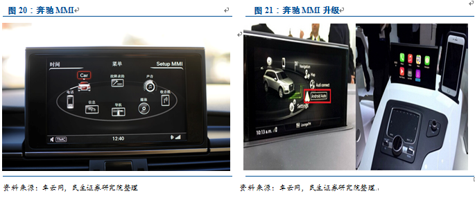 車企通過升級改造原有車載設備以及與互聯網公司合作來布局智能汽車。隨著互聯網公司積極涌入,把車載智能設備作為進攻方向之一后,傳統車企也積極主動提升自身車載設備的智能化程度,滿足當今互聯、交互智能的大趨勢和消費需求。具體實施上,一方面傳統車企加快了原有車載設備的升級改造,采用智能手機、智能手表等作為連接的入口方式,融入更多的交互智能因子,提升其智能化;另一方面傳統車企也以開放的懷抱接納互聯網公司與之合作配合,如奧迪升級的MMI就同時支持Carplay和Android Auto。