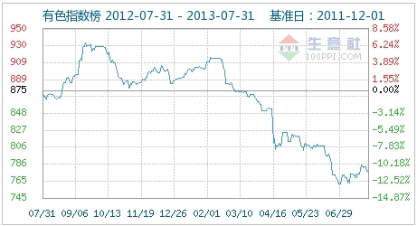 7月31日有色指數為776點,較周期內最高點1005點(2012-01-31)下降了22.79%,較2013年06月30日最低點762點上漲了1.84%。