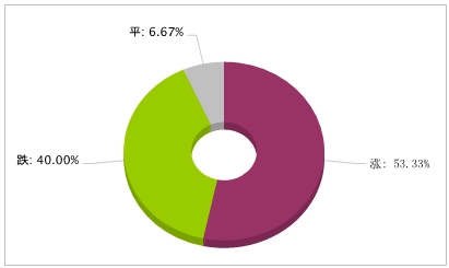 環比下降的商品共有12種,跌幅在5%以上的商品共2種,占該板塊被監測商品數的6.7%;跌幅前3的產品分別為海綿鈦0級(-14.26%)、鉍(-10.68%)、鉬精礦(-3.21%)。
