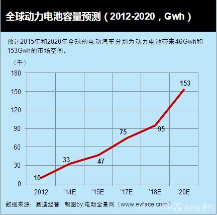 從電動汽車來看,預(yù)計2015年和2020年全球的電動汽車的產(chǎn)量分別為430萬輛和1100萬輛,而其中包含EV、PHEV和HEV,其動力電池單位容量平均分別為50Kwh、10Kwh和2Kwh,2015年和2020年分別為動力電池帶來46Gwh和153Gwh的市場空間。