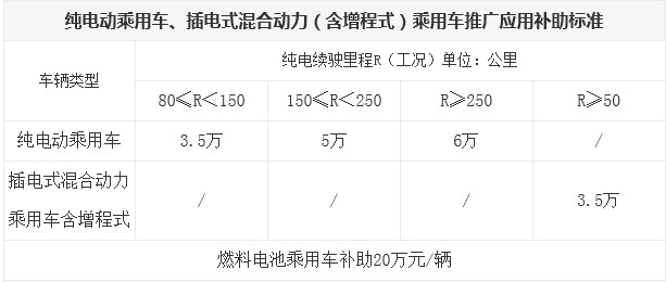 新的補貼政策是以在電力驅動下行駛的里程為指標,新規(guī)定指出,乘用車以純電行駛里程(R)為標準,插電式混合動力乘用車(含增程式)R≥50每車補貼3.5萬元,純電動乘用車80≤R<150每車3.5萬、150≤R<250每車5萬、R≥250每車6萬元。新的補貼公告附表中,特別提到了燃料電池乘用車(補貼20萬)和燃料電池商用車(補貼50萬)的補助標準。