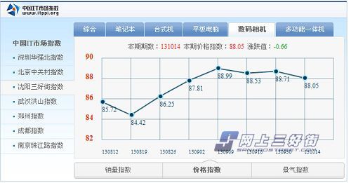 與銷量指數(shù)的持續(xù)走低到平穩(wěn)完全相反,價(jià)格指數(shù)持續(xù)走高到最終平穩(wěn)。期初130819期為最低點(diǎn)84.42,這個(gè)時(shí)候相機(jī)廠商都在蓄力發(fā)布新品,各大商家 都紛紛開始清理庫(kù)存,對(duì)庫(kù)存商品進(jìn)行低價(jià)促銷的處理。自130819期往后,新品逐漸發(fā)布,價(jià)格趨勢(shì)持續(xù)上漲從84.42點(diǎn)到86.25點(diǎn)到87.81點(diǎn) 到最高130909期的88.99點(diǎn),這個(gè)區(qū)間正好處于相機(jī)產(chǎn)品新舊交替,清理的舊貨逐漸被新貨所取代,價(jià)格也就自然高漲。從130909期開始到目前的 131014期相機(jī)產(chǎn)品的新舊交替逐漸結(jié)束,新品占據(jù)主流,價(jià)格指數(shù)自此趨于穩(wěn)定。