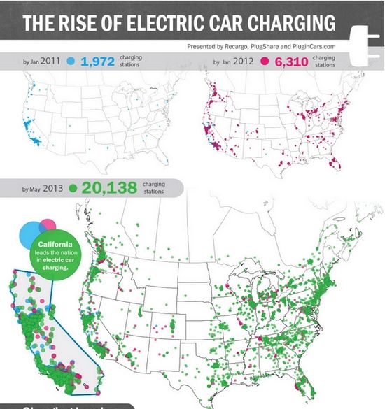 過去兩年間,美國充電站數量擴充了10倍。2011年,美國充電站數量是1972個,并且基本上集中在加州地區,到2012年1月,這一數字是6310,而到2013年5月,全美充電站數量達到20138個,加州依然走在最前列,但美國東部地區的基礎配套設施增長速度同樣驚人。