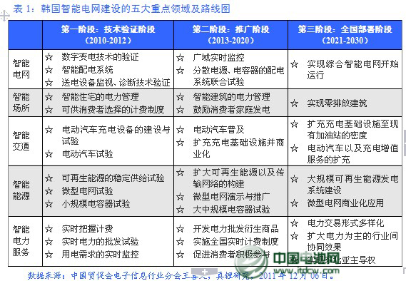 目前韓國政府正在濟州島開展智能電網實證試驗。韓國智能電網協會為韓國的智能電網建設發布了階段性目標:到2012年建造世界最高水平的智能電網示范城市;到2020年建造以消費者為主的廣域單位智能電網,實現CO2減排25%;到2030年之前在全國構建智能電網,帶動5萬人就業并培育74萬億韓元(約合人民幣6,000億元)的內需。韓國智能電網建設的重點領域和路線圖見表1。與此同時,韓國政府還不余遺力在全球進行宣傳和推廣,力爭到2030年能使韓國企業在全球智能電網市場中占據30%的市場份額,創造又一個“漢江奇跡”。