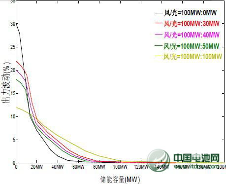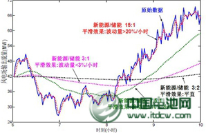 對于不同的風(fēng)光發(fā)電比例以及不同的儲能配比所可能出現(xiàn)的結(jié)果,國家電網(wǎng)也做了認(rèn)真研究,見圖6,這都是根據(jù)張北地區(qū)的實(shí)際情況模擬的。從圖6上可以看到,國家電網(wǎng)認(rèn)為,新能源發(fā)電(本項(xiàng)目僅指風(fēng)力發(fā)電+光伏發(fā)電)規(guī)模與儲能裝置規(guī)模比為3:1時(shí),從經(jīng)濟(jì)性和平滑效果來看,能達(dá)到最佳結(jié)合。從張北項(xiàng)目一期工程來看,配比為7:1,接近圖中7.5:1的綠線,平滑效果:波動(dòng)量≈10%/小時(shí)。
