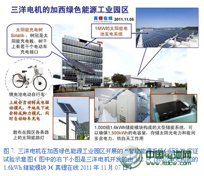 圖7是三洋電機(jī)在加西綠色能源工業(yè)園區(qū)開展的“智能能源系統(tǒng)(SES)”實(shí)證試驗(yàn)示意圖,基本上能說明白問題,這里就不重復(fù)介紹。該項(xiàng)試驗(yàn)工程共投資約50億日元,導(dǎo)入了1MW的太陽能發(fā)電系統(tǒng)、1,500kWh的儲能系統(tǒng)以及控制多種節(jié)能設(shè)備的SES系統(tǒng)等。三洋電機(jī)提出了將“CO2排放量削減25%”的目標(biāo),每年將削減2,480噸的CO2排放量,同時(shí),三洋電機(jī)希望通過這項(xiàng)試驗(yàn),找到“家庭、大樓、城市三位一體能源解決方案”。從這可以看到,松下和三洋電機(jī)瞄準(zhǔn)了未來智能城市建設(shè)這個(gè)巨大市場。