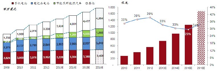 過去兩年是電解液新增產能高峰期,預計2013年全球電解液產能在7.5萬噸,中國將在4萬噸。到2015年,全球電解液產能為15萬噸,中國將在8萬噸。從下游應用看,3C領域是鋰電發展主戰場,而動力電池領域的突破口在于電動車在公共領域的示范效應。2012年全球電解液需求量在6萬噸。2016年后隨著動力電池和儲能領域的應用打開,電解液的需求將得到快速提升。