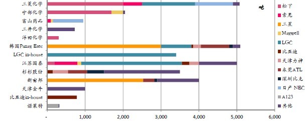電解液廠商盈利能力分化,國內一線廠商的產品價格有望在3.5萬元/噸(不含稅)處企穩。電解液企業的核心競爭力在于以添加劑為核心的配方,通過強大的技術開拓能力和客戶服務能力能夠進入頂尖電池廠商的供應鏈體系,通過協同合作進一步提升自身實力,達到一種良性循環。國內龍頭企業新宙邦已經成為三星、松下、索尼、ATL和比克的供應商;江蘇國泰已經成為松下、索尼、Maxell、三星、LG化學、比亞迪和力神的供應商;東莞杉杉已經成為比亞迪、力神、ATL和比克的供應商。