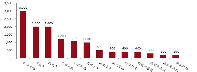 六氟磷酸鋰國產化進程加速。2013年中國六氟磷酸鋰將迎來生產高峰,銷量將超過3200噸,同比增長130%,全年預計進口量300噸,同比2012年1000噸規模大幅下降。六氟磷酸鋰獨具的性能優勢使得其成為目前電解質的主導品種。六氟磷酸鋰對于水、氟化氫以及金屬雜質控制要求及其嚴格,具有較高的技術壁壘。全球來看,2011年日本的瑞星化工(Stella)、森田化學和關東電化是六氟磷酸鋰的主要生產商,占全球產能的55%左右;而到2013年中國國內廠商技術突破的同時快速擴張產能,行業競爭激烈。龍頭企業多氟多、九九久和天津金牛憑借深厚的技術底蘊和先發優勢集中擴產并提升產品品質,預計到2015年六氟磷酸鋰中國產能全球占比將達40%。