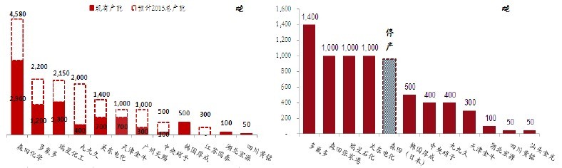 圖表1:全球主要六氟磷酸鋰生產商及擴產計劃(左圖),2013年六氟磷酸鋰生產商出貨量預測(右圖)