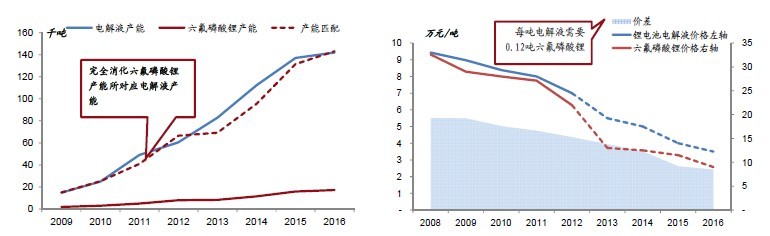 圖表3:六氟磷酸鋰及電解液產能釋放模擬曲線(左圖),六氟磷酸鋰價格模擬曲線(右圖)