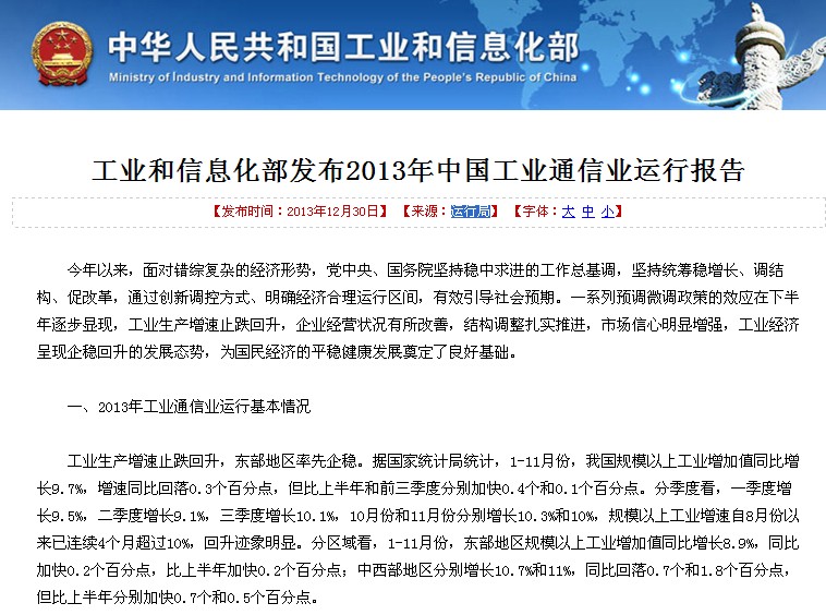 今年以來,面對錯綜復雜的經濟形勢,黨中央、國務院堅持穩中求進的工作總基調,堅持統籌穩增長、調結構、促改革,通過創新調控方式、明確經濟合理運行區間,有效引導社會預期。一系列預調微調政策的效應在下半年逐步顯現,工業生產增速止跌回升,企業經營狀況有所改善,結構調整扎實推進,市場信心明顯增強,工業經濟呈現企穩回升的發展態勢,為國民經濟的平穩健康發展奠定了良好基礎。