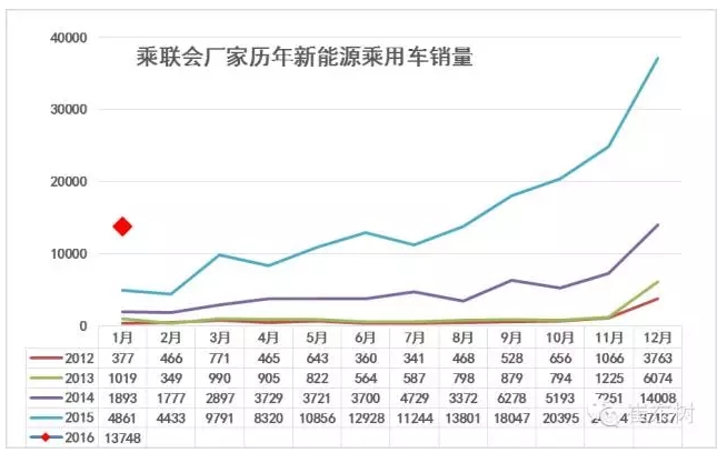 1月的新能源車銷量13748臺(tái),同比15年1月的4861臺(tái)增長1.8倍,增速仍保持較高水平。歷年的新能源車都是前低后高的加速拉升走勢(shì),15年從8月以來的新能源車銷量進(jìn)入拉升軌跡,15年年末幾個(gè)月都是月度環(huán)比暴增,12月更是環(huán)比暴增萬臺(tái)左右,市場(chǎng)熱度快速升溫。16年1月的降溫是符合正常的走勢(shì)特征的。