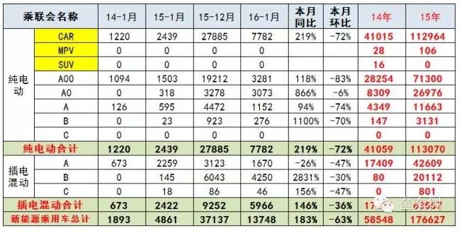 1月新能源乘用車呈現(xiàn)同比高增長和環(huán)比深度調(diào)整的特征。2016年1月新能源狹義乘用車銷量13748臺(tái),同比增長183%,環(huán)比12月下降63%,總體較好。其中插電混合動(dòng)力達(dá)到5966臺(tái),同比增長146%,環(huán)比下降36%;純電動(dòng)車達(dá)到7782臺(tái),同比增長219%。環(huán)比下降72%。16年插電混動(dòng)同比增速表現(xiàn)弱于純電動(dòng)轎車,但插混新能源車環(huán)比12月的增速更穩(wěn)健。