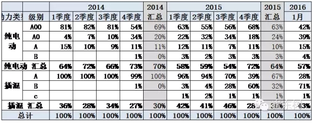 15年的純電動(dòng)車中的A00級(jí)車占比達(dá)63%,且A0級(jí)成為純電動(dòng)乘用車的絕對(duì)主力,這兩類組合的經(jīng)濟(jì)型電動(dòng)車成為主力。但16年1月的A級(jí)電動(dòng)車爆發(fā)增長到15%,這是暫時(shí)的年度波動(dòng)數(shù)量的特殊狀態(tài),同時(shí)也是A00級(jí)電動(dòng)車的暫時(shí)調(diào)整的影響。