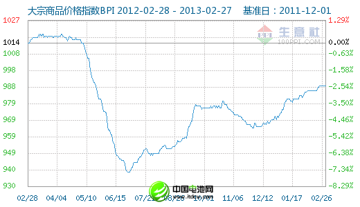 2月26日大宗商品價格指數BPI為989點,與昨日持平,較周期內最高點1019點(2012-04-10)下降了2.94%,較2012年07月02日最低點938點上漲了5.44%。(注:周期指2011-12-01至今)