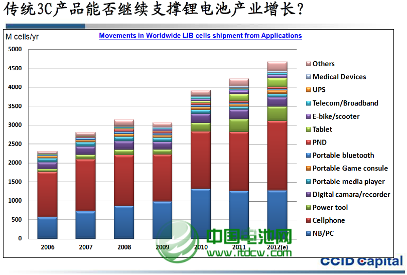 傳統的3C小鋰電池已經呈現技術成熟、品牌集中態勢,筆記本、手機、數碼相機、IPAD、電動工具等數碼、工具類終端產品市場增長繼續呈現穩步增長趨勢,但明顯放緩。