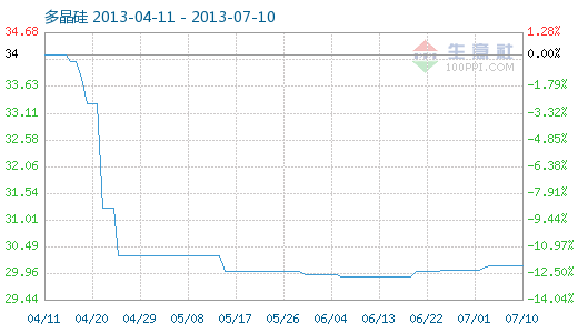 7月10日多晶硅商品指數(shù)為30.10,與昨日持平,較周期內(nèi)最高點(diǎn)100.00點(diǎn)(2011-09-08)下降了69.90%,較2012年12月24日最低點(diǎn)29.12點(diǎn)上漲了3.37%。(注:周期指2011-09-01至今)
