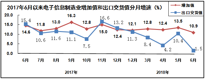 上半年,規(guī)模以上電子信息制造業(yè)實現(xiàn)出口交貨值同比增長6.1%,增速同比回落7.3個百分點;6月份,電子信息制造業(yè)出口交貨值僅增長1.5%。