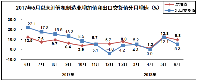 上半年,計算機制造業(yè)增加值同比增長7.6%。出口交貨值同比增長5.6%。主要產(chǎn)品中,微型計算機設(shè)備產(chǎn)量同比增長0.5%,其中筆記本電腦產(chǎn)量同比增長1.7%;平板電腦產(chǎn)量同比下降3.2%。