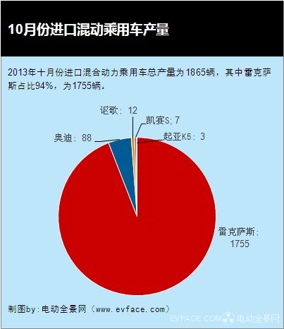 2013年十月份進口混合動力乘用車總產量為1865輛,其中雷克薩斯占比94%,為1755輛。排在第二位的是奧迪牌,為88輛,謳歌、凱宴、起亞加起來不過22輛,雷克薩斯的零頭都不到,只占總產輛的1