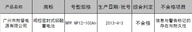抽查中發(fā)現(xiàn),標(biāo)稱廣州市耐普電源有限公司生產(chǎn)的一批次“NPP”閥控密封式鉛酸蓄電池(NP12-100Ah2013-04-03),信息與警告標(biāo)記的存在與耐久性項(xiàng)目不合格。